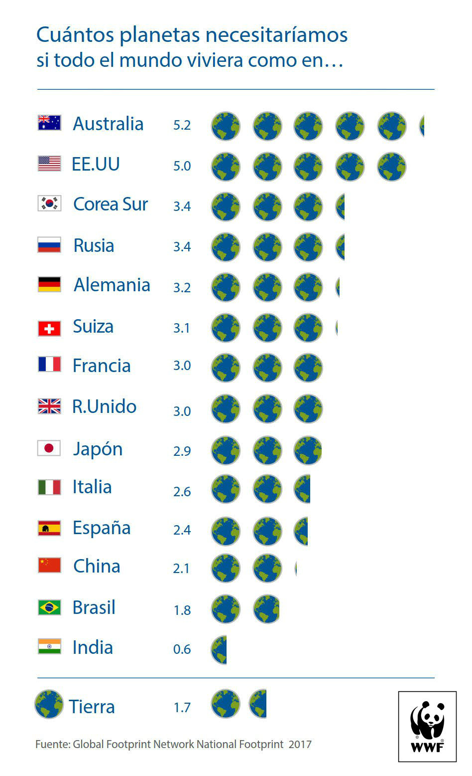 Hoy, para suplir nuestras demandas de la naturaleza necesitaríamos 1.7 planetas Tierra. Sin embargo, no todos consumimos de la misma manera. Según lo muestra Global Footprint Network en su página dedicada al sobregiro ecológico (www.overshootday.org), los ciudadanos de Corea del sur necesitarían 8.8 países para completar sus demandas de la naturaleza, en la lista la continúan los japoneses que deberían tener 7.1 países, los suizos con 4.3 y los chinos con 3.9 países.