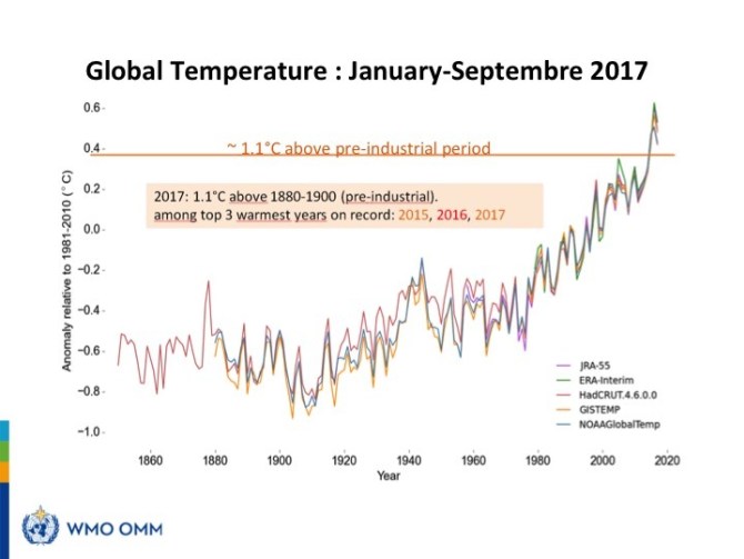 De confirmarse las previsiones de la Organización Meteorológica Mundial, 2016 continuaría siendo el año con mayores temperaturas observadas hasta la fecha como consecuencia del fenómeno de El Niño, mientras 2017 y 2015 ocuparán el segundo y el tercer lugar, respectivamente. "Es parte de la tendencia al calentamiento a largo plazo", asegura Petteri Taalas. El secretario general de la entidad ha recordado que durante los últimos meses "hemos sido testigos de fenómenos meteorológicos extraordinarios, temperaturas que han llegado a +50°C en Asia, huracanes sin precedentes en el Caribe y en el Atlántico que han llegado hasta Irlanda, devastadoras inundaciones monzónicas que han afectado a muchos millones de personas y una sequía implacable en África oriental".